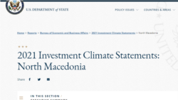 ВАШИНГТОН - Корупцијата, честите законски и регулативни измени, неконзинстентната интерпретација и импелемнтација креираат несигурна бизнис клима во државата а во јавните набавки корупцијата и митото не се невообичаена појава како за домашните тала и за странските компании, стои во најновиот Извештај за инвестициска клима за 2021 на американскиот Стејт департмент.