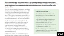 Во извештајот се истакнува дека имало двоцифрено зголемување на одобрувањето на лидерството на САД во 59 земји и територии помеѓу 2020 и 2021 година.