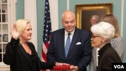 ВАШИНГТОН - Ангела Агелер положи официјална заклетва како нова амбасадорка на САД во Македонија на свечена церемонија во Стејт Департментот во Вашингтон. Таа во земјава доаѓа на местото на досегашната амбасадорка Кејт Мери Брнз.