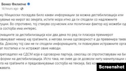 „Доколку Мицкоски поседува било какви информации за можна дестабилизација или нарушување на мирот во земјата, истите мора итно да ги сподели со надлежните институции. Во спротивно, тој станува соучесник или политички фактор кој можеби од таквата состојба има интерес. Информациите за дестабилизација кои два дена по ред ги пласира премиерот предизвикуваат немир кај граѓаните, а негова лична одговорност е да превенира таква состојба. Доколку тој сам не ги сподели информациите, ги повикувам истражните органи да поведат постапка и ги истражат овие наводи“, напиша Филипче на официјалната страна на социјалната мрежа „Фејсбук“