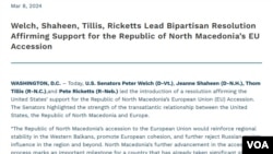 САД го поддржаа пристапувањето на Северна Македонија во Европската Унија (ЕУ) во најнова резолуција во Сенатот, спонзорирана од демократскиот сенатор од Вермонт Питер Велч, демократската сенаторка од Њу Хемпшир Џин Шахин и републиканските сенатори од Небраска и Северна Каролина Пит Рикетс и Том Тилис.